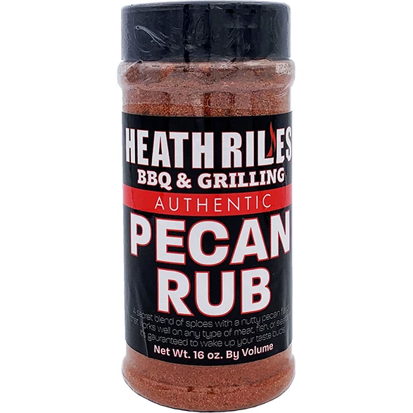 Heath Riles Pecan Rub provides a sweet nutty BBQ blend that enhances the flavor of pork, beef, chicken and fish.