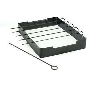 If you’re a grill master or tailgating enthusiast, then you know the convenience and ease of making kabobs. Coated with a nonstick finish, this shish kabob frame with skewers cooks kabobs in two different ways. Both slots and holes line each side of the frame. The quickest cooking method is to load the six 13-1/2-inch skewers with chunks of meat and/or vegetables and lay them on top of the frame in the designated slots. The skewers are then rotated by hand while the frame stays in position. The second method is to insert a skewer part-way into a hole on the side, push it through the desired chunks of food, then insert the pointed tip into the hole across the frame. This way the entire frame can be flipped over at once. Measuring 13″ by 10-1/4″ inches when open for grilling, the frame conveniently folds in half by means of a hinge for compact storage. The nonstick finish makes clean-up easy. To ensure the longevity of the finish, washing by hand is recommended. Create perfect kabobs every time!