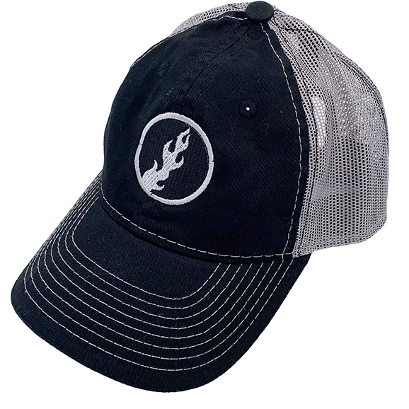 The Kansas City BBQ Store’s logo flame embroidered logo on a snap back, mesh ‘trucker’ style hat in black with a grey back.