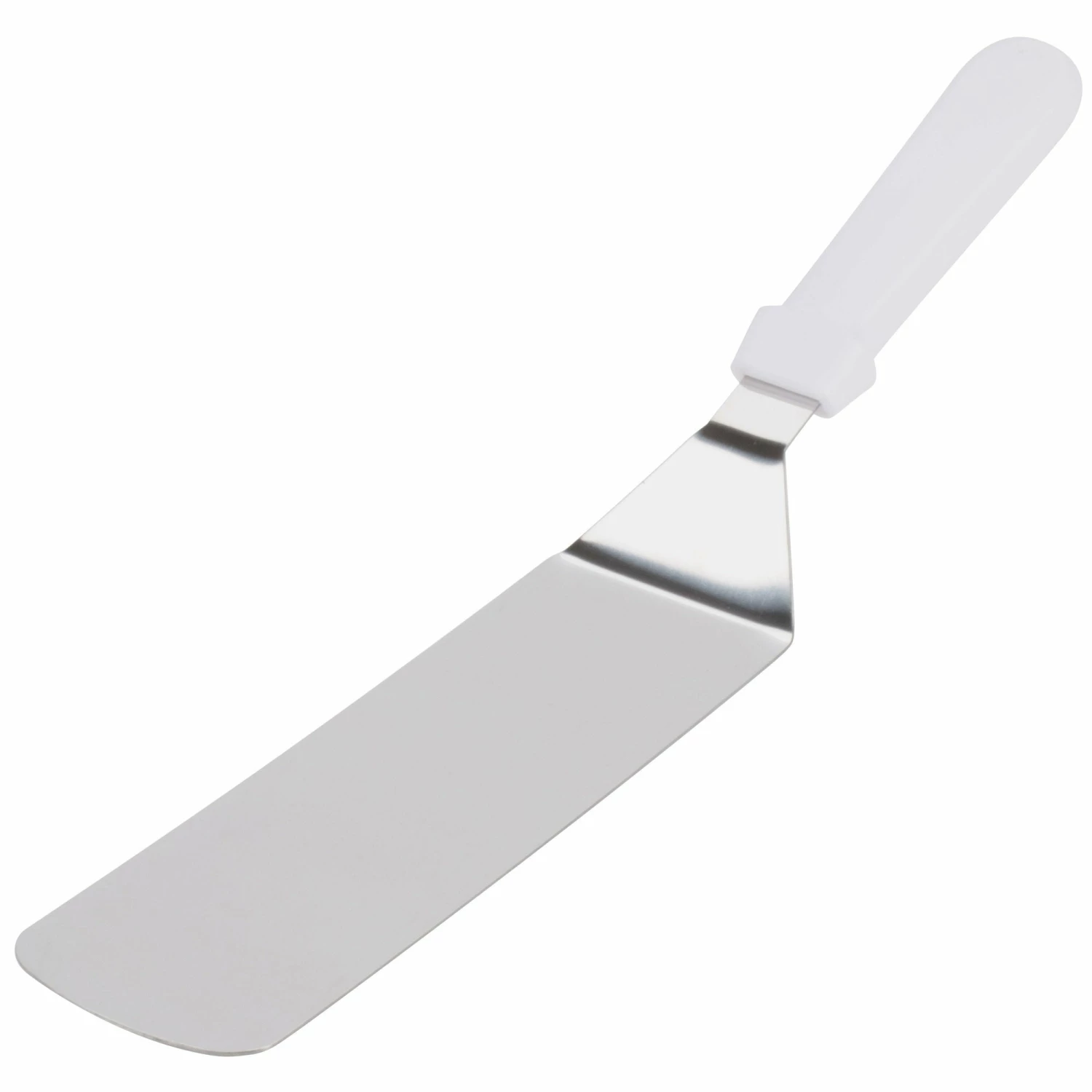 Quickly and easily flip meats, poultry, and vegetables on your flat top griddle with this 8 1/2″ x 3″ solid turner with round blade and white plastic handle! Featuring an easy-to-clean white plastic handle, this turner is the sanitary solution to flipping hamburgers, chicken breasts, and grilled vegetables, then removing them from the griddle. The round stainless steel blade protects the product from punctures, preserving product quality to boost customer satisfaction. At the same time, the durable stainless steel blade is guaranteed to give you the longevity you need, and a special hardening process on the blade results in excellent corrosion resistance, too.